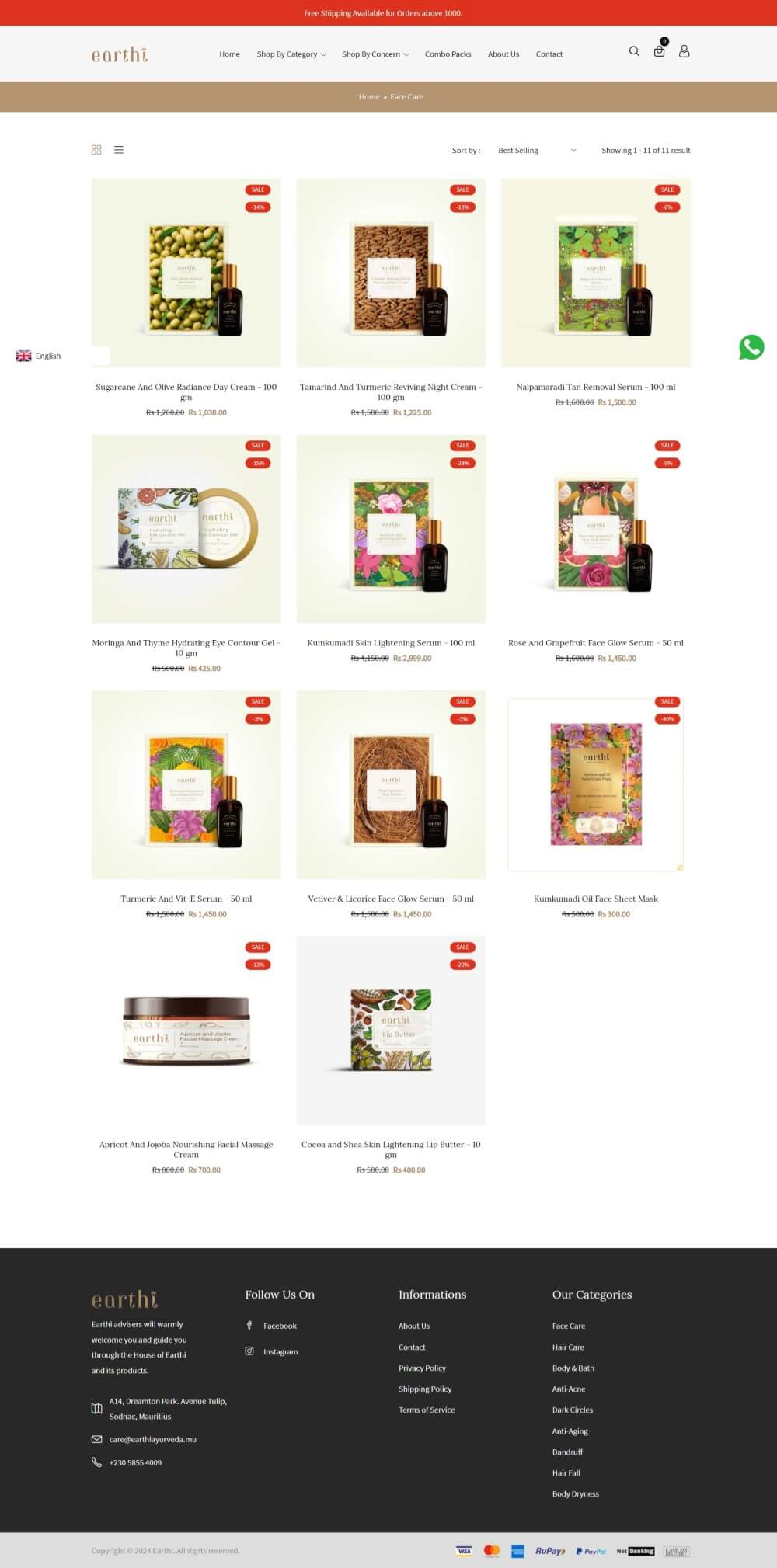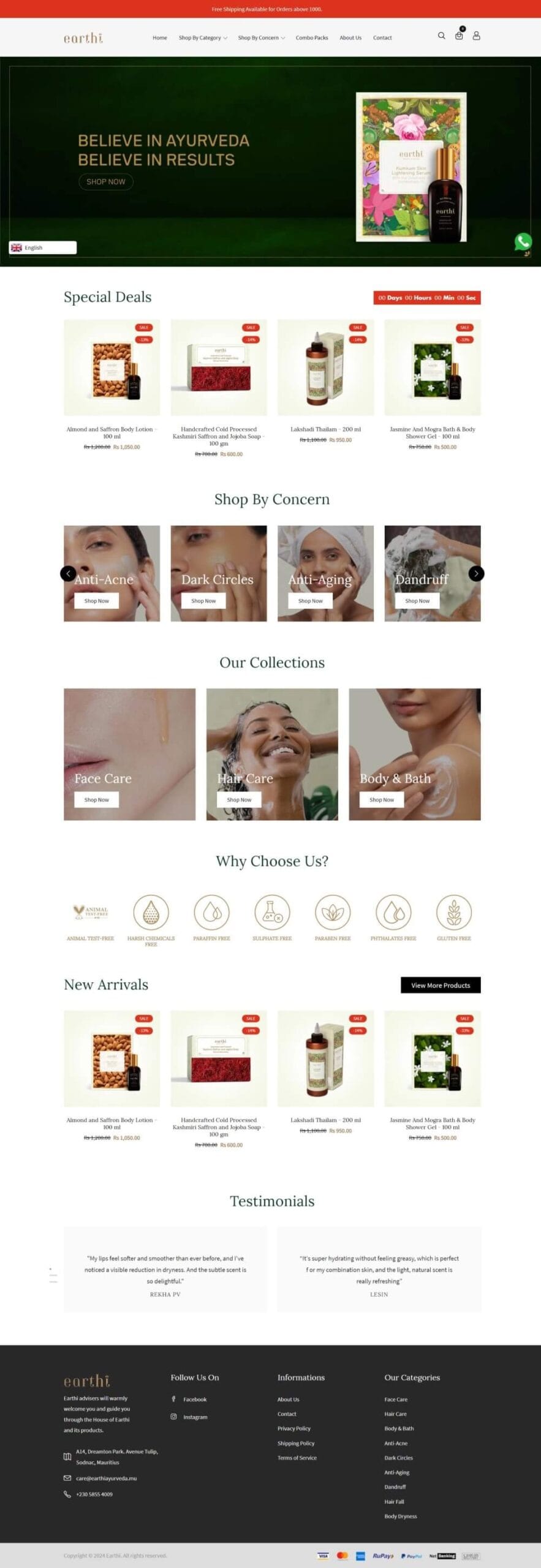 Earthi AyurvedaWebsite Url: https://earthiayurveda.mu/Platform: Shopify Other WorksAll Bicycle KartShopify YUR OfficialShopify One Point FinanceWordPress ReformediaWordPress Herlyn JewelsShopify Charnock HospitalWordPress Blue Sky Water SportsShopify Priya FabricsShopify MNR – Habtoor Landing PageWordPress Med7 ClinicWordPress Dare NetworkWebflow Earthi AyurvedaShopify Med7 OnlineShopify Brand LadyWordPress Bliss GardenWordPress TCTWordPress WalkarooShopify BluetygaShopify Organic NetraShopify Meruzila Convention centerWordPress CraftiseShopify Lady LoafellaWordPress WatiaaShopify