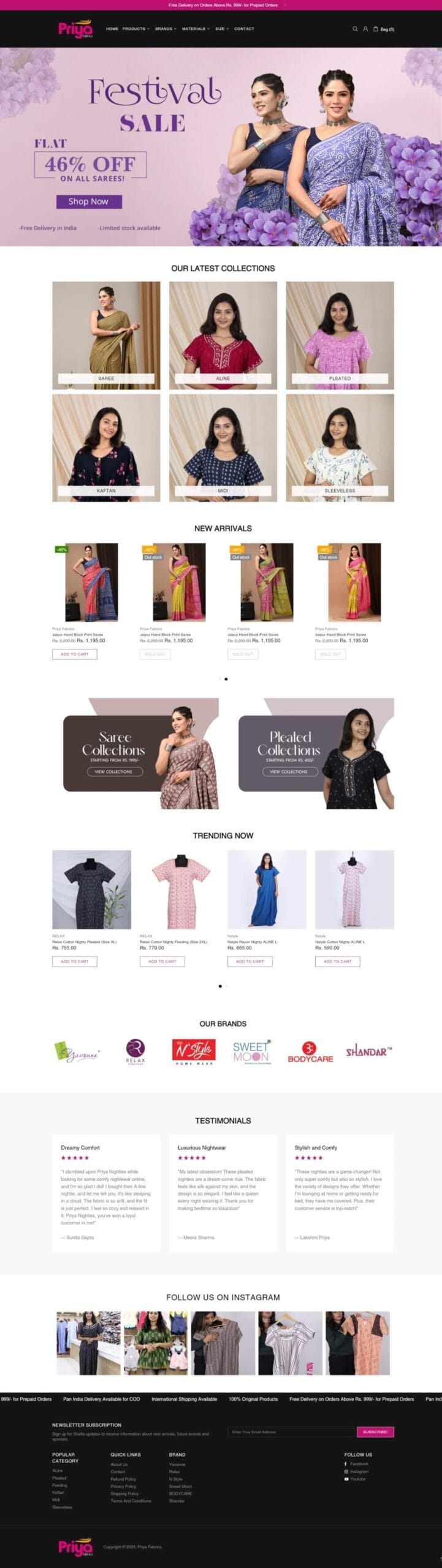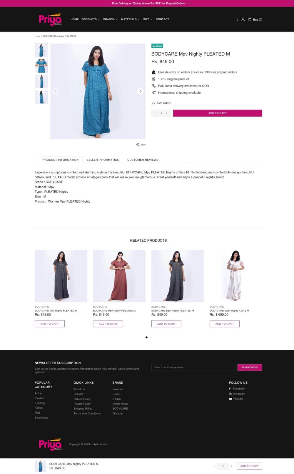 Priya FabricsWebsite Url: https://priyafabrics.in/Platform: Shopify Other WorksAll Bicycle KartShopify YUR OfficialShopify One Point FinanceWordPress ReformediaWordPress Herlyn JewelsShopify Charnock HospitalWordPress Blue Sky Water SportsShopify Priya FabricsShopify MNR – Habtoor Landing PageWordPress Med7 ClinicWordPress Dare NetworkWebflow Earthi AyurvedaShopify Med7 OnlineShopify Brand LadyWordPress Bliss GardenWordPress TCTWordPress WalkarooShopify BluetygaShopify Organic NetraShopify Meruzila Convention centerWordPress CraftiseShopify Lady LoafellaWordPress WatiaaShopify